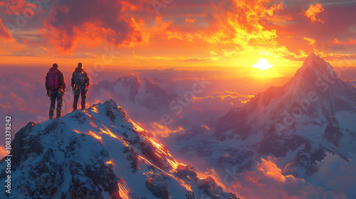 Two climbers celebrating their achievement on a snowy mountain peak at sunset, perfect for adventure travel marketing, outdoor sports events, and motivational campaigns.