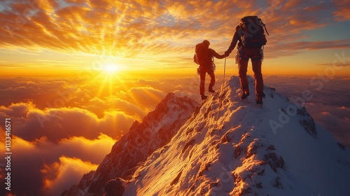 Two climbers on a snowy peak at sunset, symbolizing adventure and teamwork.