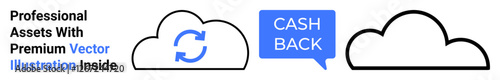 Two cloud graphics emphasize cashback with a speech bubble and vector refresh symbol. Ideal for finance, e-commerce, cloud computing, file sharing, rewards programs, tech services, flat landing page