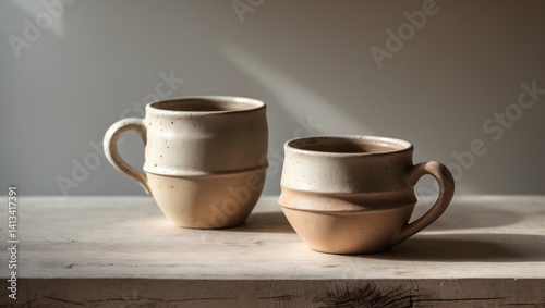 Two coffee mugs in different shades on a wooden tabletop, home decoration, product photography, arts and crafts