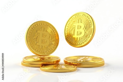 Two coins flipping simultaneously, isolated against white backdrop , studio, multiple