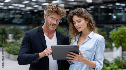 Two colleagues collaborate on a project using a digital tablet in a modern office bathed in soft natural light. The scene captures teamwork, innovation, and effective communication in a creative works