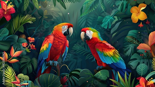 macaw, parrot, tropical, forest, jungle, bird, colourful, vibrant, illustration, art, paradise, exotic, flower, leaf, greenery, plant, tree branch, parrot, macaw, sitting, duet, rainforest, nature, wildlife, animal, avian, beak, feather, wing, tail, foliage, flora, fauna, ecosystem, natural, beauty, lush, green, tropical paradise, digital artwork