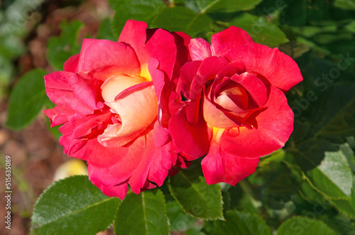 Two colorful red yellow roses Decor Arlequin in the city garden
