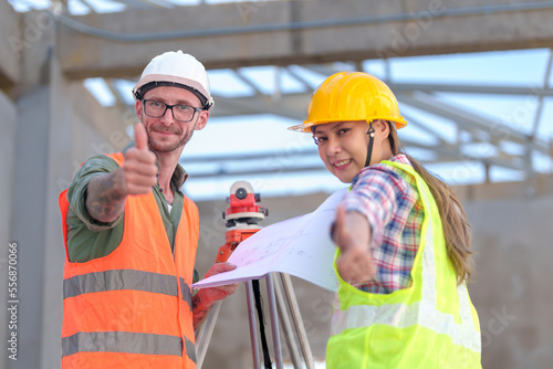 Two Construction Worker show success Using Theodolite Surveying Optical Instrument for Measuring Angles in Horizontal and Vertical Planes on Construction Site. Engineer and Architect Using blueprint