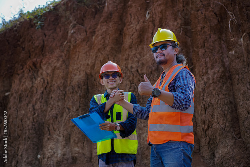 indonesia, asian, people, teamwork, discussion, engineer, expertise, handshake, hard hat, horizontal, male, man, photo, safety, two people, color image, construction worker, glove, protective, bonding, dirt, engineering, explaining, manager, meeting, occupation, shirt, showing, success, togetherness, men at work, working, year, young adult, copy space, happiness, smiling, work, architect, civil, collar, confidence, contract, contractor, cooperation, development, document