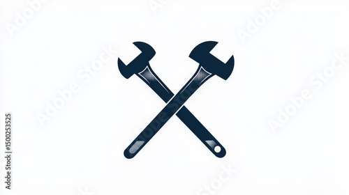 two crossed hammers and a wrench on a white background, featuring thin black outlines, simple geometric shapes