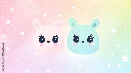 pastel, cute, cartoon, rabbit, animal, soft, light, colours, rainbow, star, adorable, whimsical, design, illustration, graphic, drawing, simple, figure, character, friendly, digital, art, background, image, 2, pink, blue, colourful