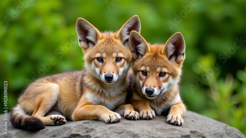 coyote, puppy, animal, wildlife, nature, mammal, canino, portrait, cute, adorable, outdoors, closeup, furry, baby animal, small, rock, stone, grass, flora, fauna, green, wild, pair, sibling, offspring, wild animal, conservation, north america, spring, summer, daylight, day, blurred background, zoology, environment, natural world, forest, predator, wilderness