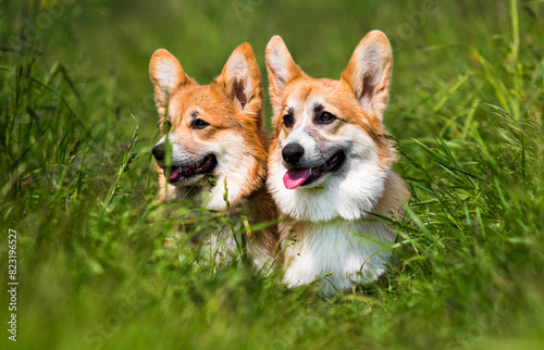 red, together, breed, canino, nature, grass, dog, puppy, pet, outside, green, cute, young, adorable, animal, happy, purebred, mammal, portrait, 2, background, white, beautiful, domestic, welsh, summer, autumn, brown