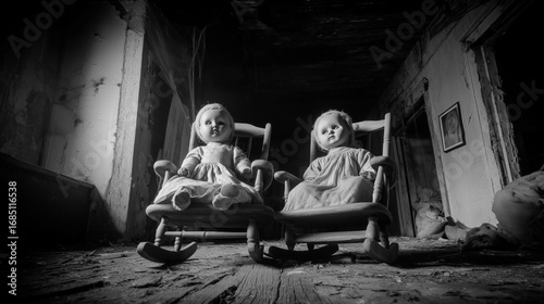 doll, sitting, rocking, chair, left, right, children, person, childhood, dark, little, children, baby, boy, cute, horror, young, infant, fear, scarey, halloween, white, caucasian, human, adorable, funny, night, small, depression, background, evil, abandoned, room, indoor, dirty, sweet, grunge, vintage, toddler, family, toy, care, beautiful, portrait, standing, photo, 1, black, antique
