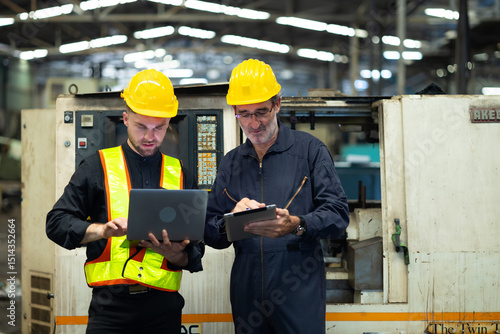 Two engineering man : Manufacture technical and factory staff working while Using digital tablet computer at industry factory