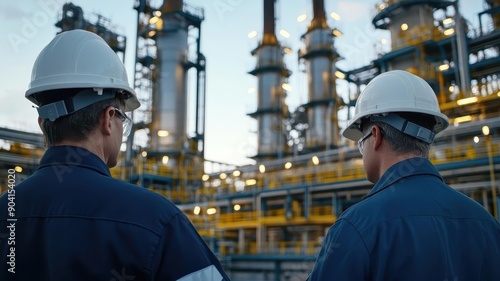 Two engineers in hard hats and safety gear inspect an industrial plant's machinery and infrastructure under evening sky.