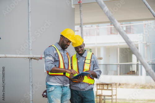 Two engineers in safety gear inspecting a building under construction. black engineers inspect ceiling infrastructure at a construction site