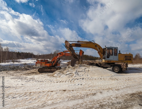 shoveling, industrial area, quarry, winter, tree, snow, cold, rust, machinery, old, signs, sky, cloud, boom, bucket, wheel, caterpillar, rock, nobody