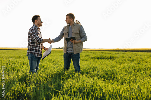 man, 2, people, field, grain, grow, growth, green, greeting, partner, work, farmer, inspector, inspecting, tablet, monitoring, smile, happy, shake hands, friendly, shake, hand, agreements, men at work, working, deal, property, land, farm, inspection, goggles, caucasian, beard, adult, horizontal, wheat, farmland, standing, day