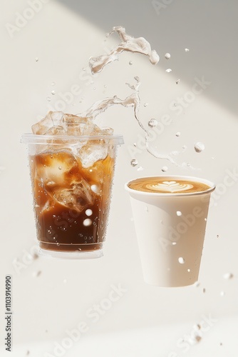 two floating coffee cups on light, neutral background.