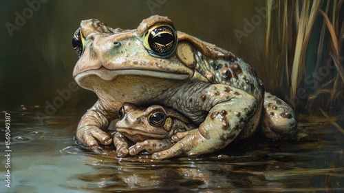 portrait, children, green, calm, frog, still, eltern, closeup, detail, father, realism, amphibian, yellow, mother, eye, duck pond, care, conservation, wet, skin, photo, wildlife, protection, texture, pair, reptile, family, water, animal, nature, love, brown