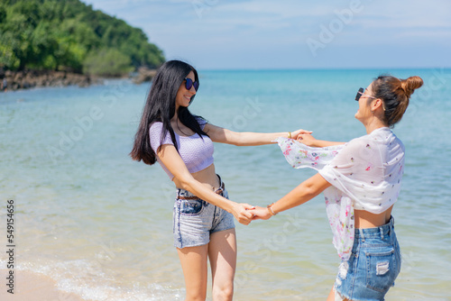 Two girlfriends hugging up and enjoying on the sea beach. A pair of girls in love cuddling on a tropical beach. romantic young lesbian couples in love and walking together on the beach.Concept of LGBT