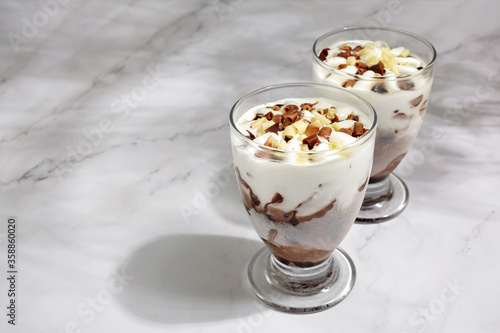 Two glasses with ice cream on marble background. Summer background
