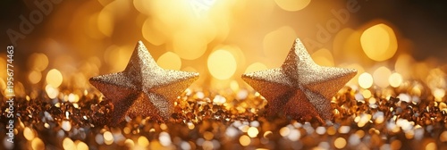 two glittering gold star ornaments on sparkling golden glitter with warm bokeh lights, festive cozy celebratory mood