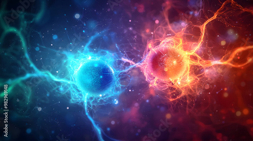 Two glowing particles, connected by an electric beam in space,visually striking arrangement with vibrant colors and glowing light,conceptual of quantum entanglement.