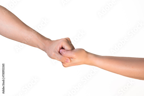 Two hands hold tightly together in different pose on isolated white background