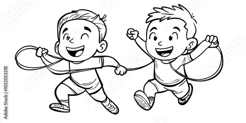 cartoon, happy, friends, boy, running, outline, black, white, children, friendship, cute, illustration, smiling, cheerful, excited, joyful, playful, athletic, active, sporty, energetic, youth, fun, teamwork, togetherness, childhood, joy, laughter