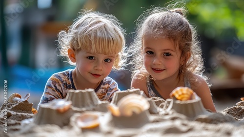 children, sandpit, play, seashell, park, fun, summer, outdoors, smiling, nature, friendship, sandbox, colourful, joy, daytime, activity, childhood, innocence, exploration, adventure, creativity, sibling, family, bonding, learning, environment, game, imagination, sunlight, shadow, happiness, carefree, curly, blond, togetherness, leisure, pastime, discovery, education, laughter, expression, teamwork, earth, texture, landscape, vibrant