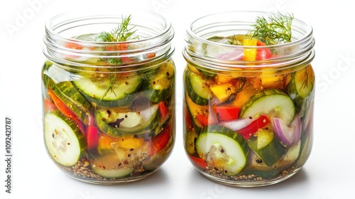 Two jars of colorful marinated pickled cucumbers and vegetables with red peppers, onions, and spices against a clean white background.