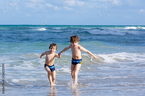 Two kid boys running on ocean beach. Little children having fun