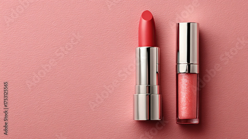 Two lipsticks in silver cases on a pink background.