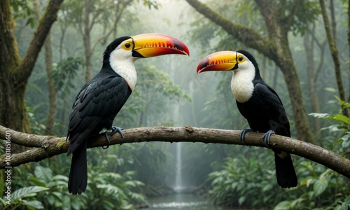 Two majestic toucans perched on a branch against misty rainforest backdrop. Their vibrant orange beaks contrast beautifully with black plumage as they face each other in perfect symmetry
