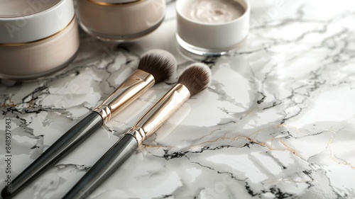 Two Makeup Brushes on a Marble Surface with Jars of Cream