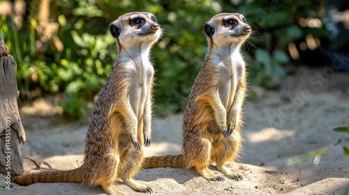Two meerkats stand upright on sandy ground, alert and watchful. Perfect for wildlife, nature, or African animal themed projects.