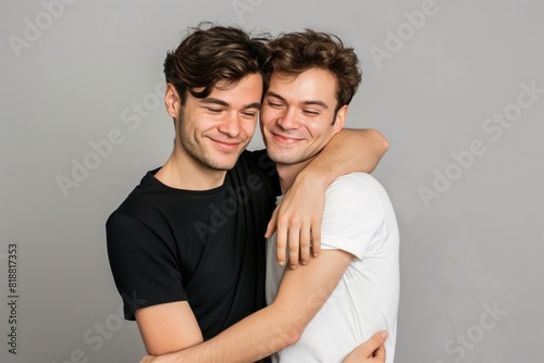 2, people, man, smiling, adult, studio shot, male, happiness, love, cheerful, togetherness, young adult, embracing, isolated, casual clothes, lifestyle, woman, portrait, front view, romance, friendship, boy, family, couple, human relationships, female, indoor, fun, bonding, photogenic, toothy smile, affectionate, relaxation, standing, waist up, joy, laughing, brown hair, adults only, enjoyment, homosexual, beauty, children, facial expression
