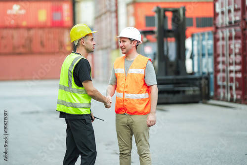 logistic, warehouse, container, shipping, cargo, freight, port, dock, industrial, industry, men at work, supervisor, teamwork, communication, management, leadership, safety, helmet, hard hat, vest, reflective, construction, storage, terminal, transport, supply, chain, export, import, delivery, distribution, coordination, planning, inspection, supervision, partnership, collaboration, authority, efficiency, business
