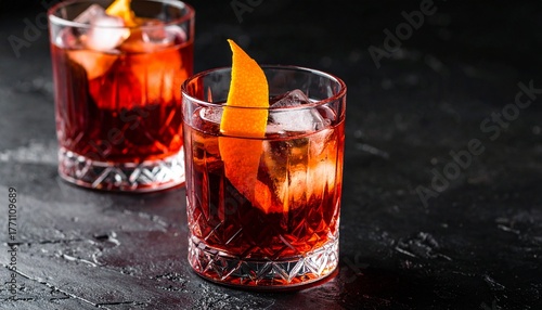 negroni, cocktail, drink, alcohol, beverage, dark, moody, red, orange, peel, garnish, ice, glasses, bar, counter, classic, aperitif, bitter, sweet, vintage, retro, photo, real, life, sophisticated, elegant, party, happy, hours, liqueur, spirit, barkeeper, celebration, holiday, service, epicure, food, style, studio, shot, couple, 2, romantic, night, club, menu, urban, modern