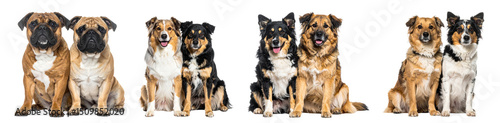 Two pairs of adorable dogs sitting side by side, showcasing their unique fur patterns.