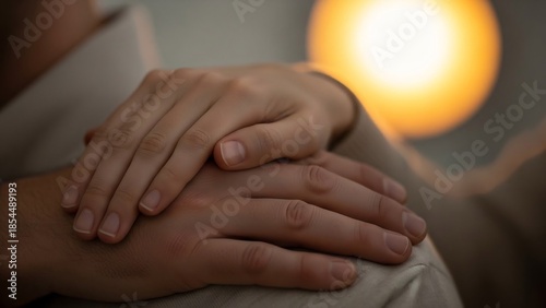 Two pairs of hands gently resting on each other, illuminated by a soft, warm, out-of-focus light source.