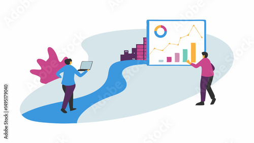 Two people analyzing data on a chart with bar graphs and a pie chart, one holding a laptop on a path