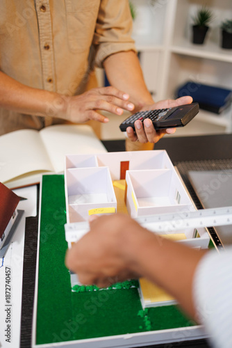 Two people are working on a house plan design. They are using various tools, working with the plan, and reviewing a house model to verify the accuracy of their work in the workplace.