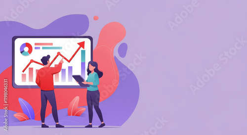 Two people discuss rising graph on screen in vibrant illustration