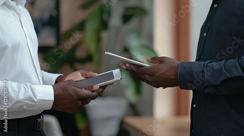 Two people exchanging digital devices for a transaction