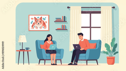 people, couple, home, living, room, interior, design, modern, comfortable, cosy, relaxation, work, laptop, computer, technology, digital, online, connection, learning, studying, browsing, freelance, remote, office, hobby, entertainment, leisure, art, dog, painting, picture, frame, wall, decor, shelf, book, window, curtain, light, lamp, table, plant, pot, green, blue, orange, furniture, couch, armchair