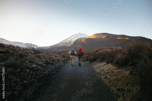 alpine, backpack, beanie, coat, cold, destination, foggy, friends, hike, landscape, maori, morning, mountain, nature, new zealand, backview, sky, snow, start, sunglasses, travel, volcano, white, wide view, winter