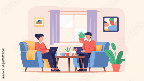 home, work, laptop, cosy, living, room, cat, people, couple, sofa, comfortable, casual attire, interior, design, modern, flat, illustration, remote, freelancer, student, learning, studying, online, browsing, digital, technology, connection, relaxed, domestic, life, lifestyle, companionship, pet, cute, creative, productive, sharpened, concentration, leisure, together, atmosphere, indoor, scene, furniture, table, window, plant, art, warm
