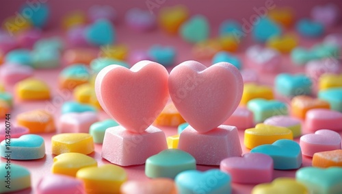 Two pink heart-shaped candies on pedestals surrounded by colorful heart candies. Romantic, sweet, love concept. Candy and confectionery imagery. The theme of love and affection.