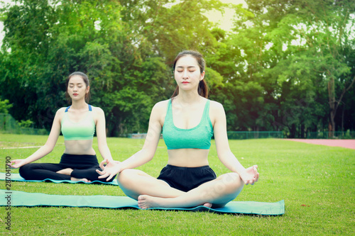 Two pretty Asian teen women are practicing yoga in the garden park at nature, sport females are doing exercises outdoor, fitness and healthy lifestyle concept.