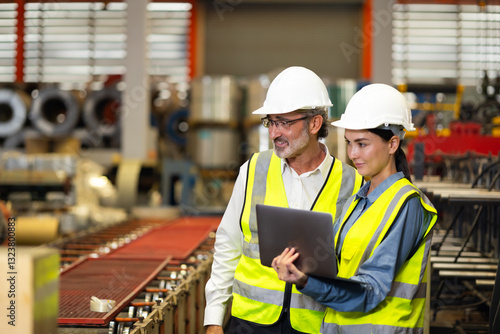 construction, factory, engineer, men at work, technician, industrial, industry, manufacture, work, manufacturing, mechanic, service, caucasian, man, woman, team, warehouse, hard, hat, hard hat, roof, sheet, steel, coil, metalwork, panel, technology, workshop, working, metal, material, metallic, operation, iron, business, building, architecture, machine, equipment, process, tile, engineering, production, plant, line, professional, helmet